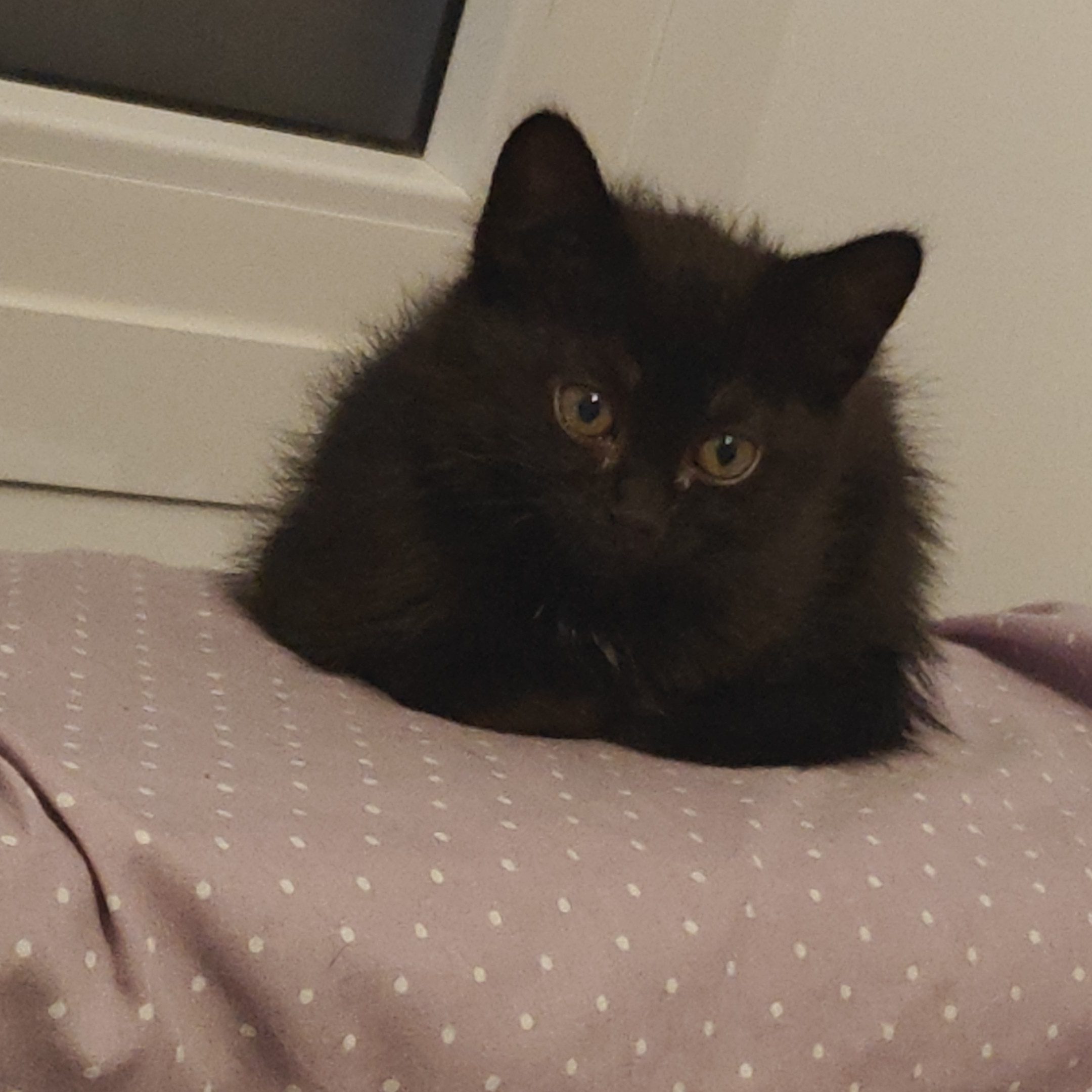 Pequeña panterita de mirada intensa y corazón enorme. Encontrada muy enferma, junto a sus hermanos, pasó unos días en el hospital, por suerte se agarró con fuerzas a la vida y ahora no para de jugar. Sus tres hermanos ya han sido adoptados. Adora acurrucarse y ronronear.