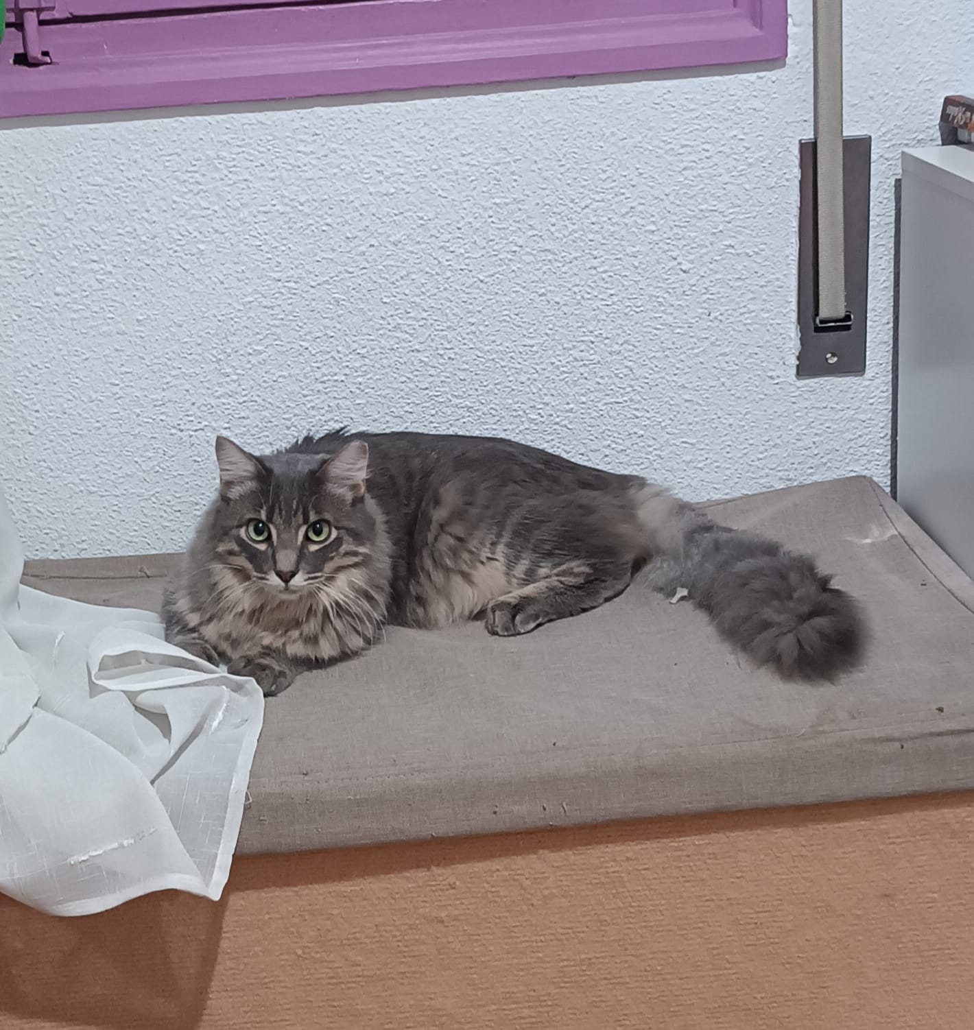 Él prefiere observar desde lo alto, tranquilo, esperando su turno. Lleva tiempo en el refugio, viendo como otros encuentran hogar, paciente con esa mirada que mezcla calma y deseo. Tiene tanto amor por dar… solo necesita alguien que mire hacia arriba y le vea.