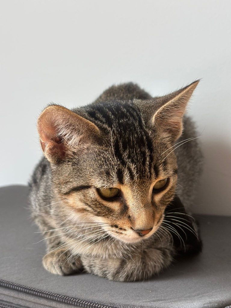 Se nota que es una gatita muy tímida, los primeros días rehuía cualquier contacto conmigo, pero poco a poco ha ido mejorando.