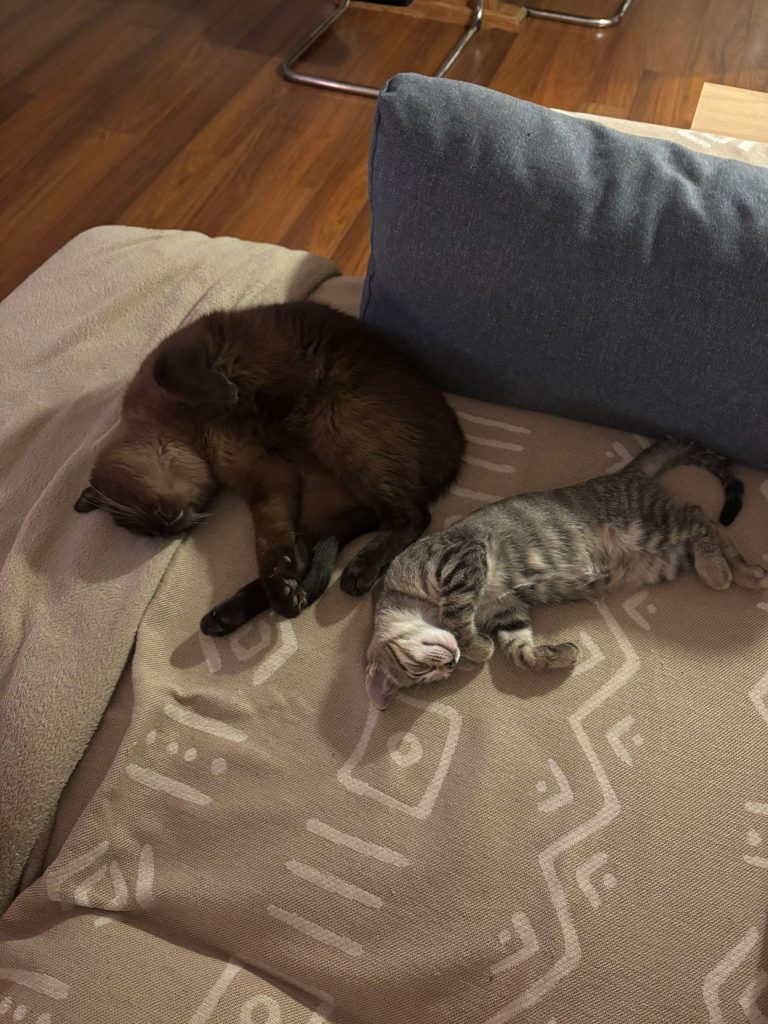 Con mi otro gato ya juegan constantemente y a mí me va dejando acariciarla más e incluso a veces se sube encima y se duerme en mi regazo.